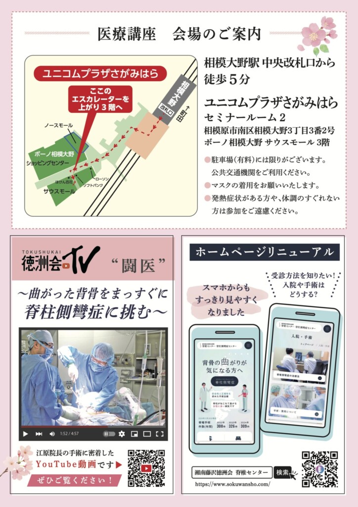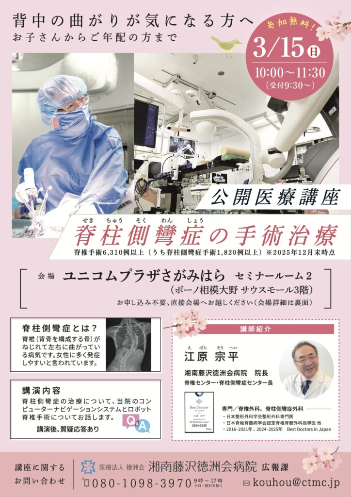 側弯症の公開医療講座のご案内!今回の公開医療講座は湘南藤沢徳洲会 脊椎センター主催です!詳細は下記をご覧ください。公開医療講座の内容『脊柱側彎症の手術治療』湘南藤沢徳洲会病院 江原 宗平 先生開催日 2026年3月15日(日)開催時間 10:00〜11:30 (受付9:30〜)開催場所 ユニコムプラザさがみはら セミナールーム2(ボーノ相模大野 サウスモール3階)費用 参加無料 ※お申し込み不要お問い合わせ先 湘南藤沢徳洲会 広報課XThreads