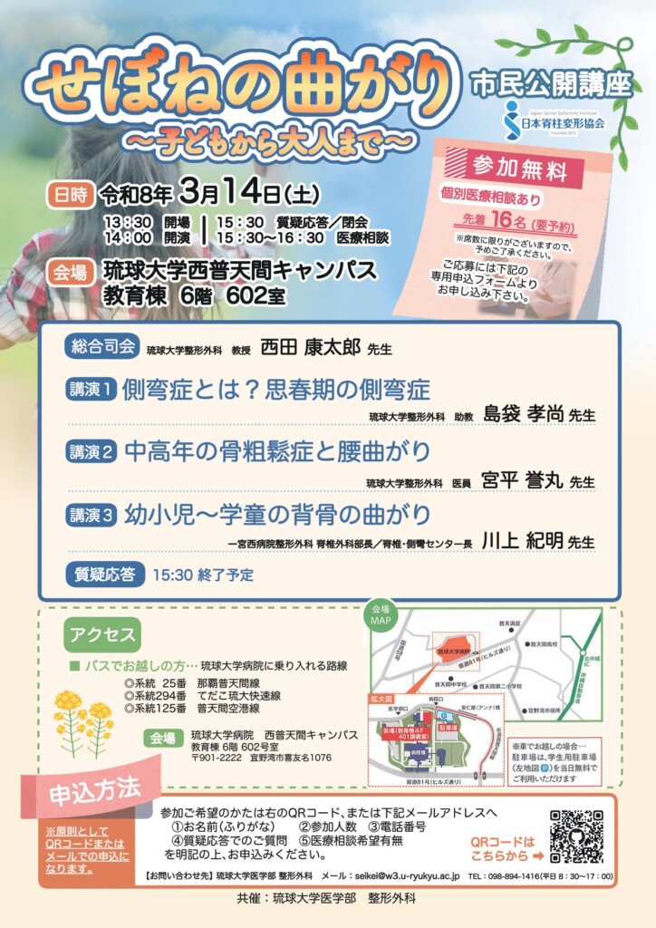今回の市民公開講座は日本脊柱変形協会と琉球大学医学部整形外科の共催です!